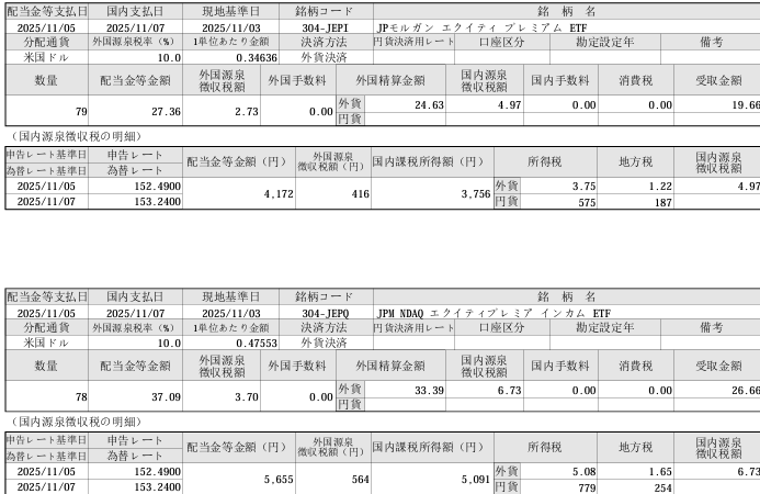先月のJEPIが3.758円、JEPQは4.585円、今月はJEPIが3.756円でJEPQは5.091円です。